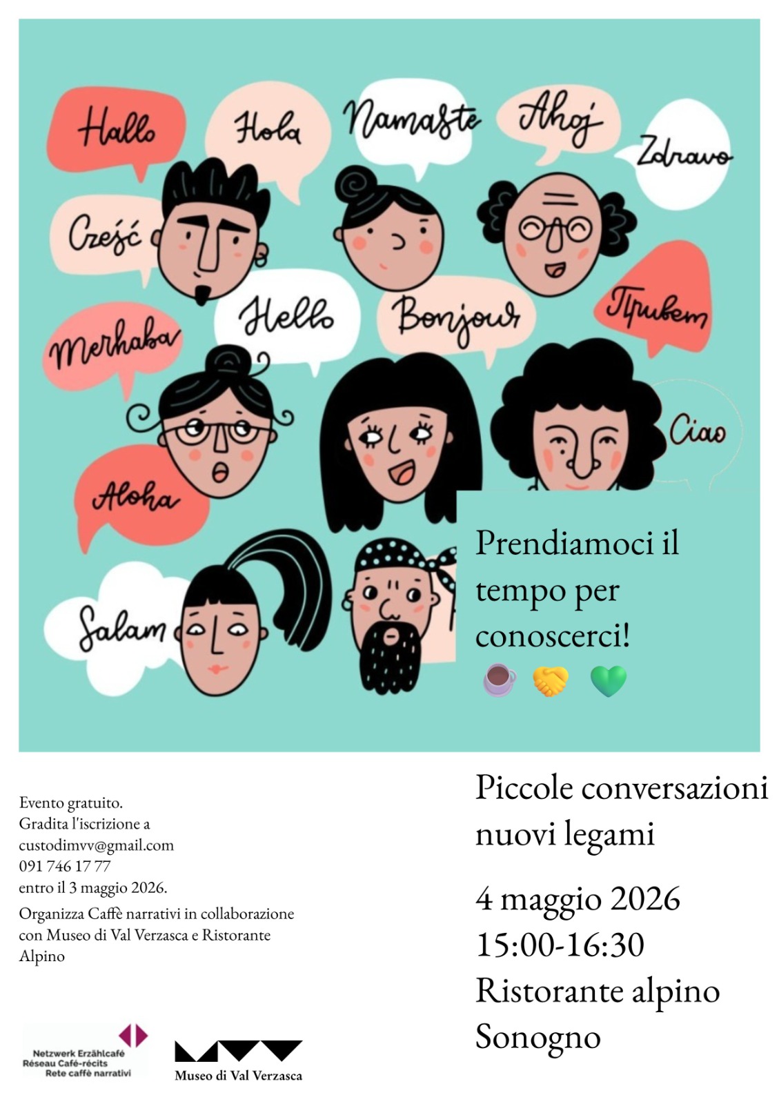La rete dei Caffè Narrativi è presente in Ticino in musei, biblioteche, case anziani. Il suo scopo è approfondire tematiche mettendo in relazione persone di contesti culturali e sociali diversi. Il ristorante Alpino di Sonogno come il Museo di Val Verzasca sono sensibili alle tematiche sociali e migratorie storiche e attuali. Per questo il Caffè Narrativo invita persone che vogliono conoscersi in un momento conviviale. Per tutte le età.