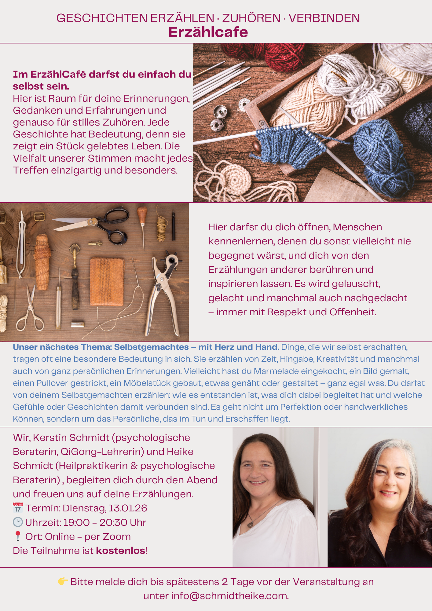 In diesem ErzählCafé darfst du von deinem Selbstgemachten erzählen: wie es entstanden ist, was dich dabei begleitet hat und welche Gefühle oder Geschichten damit verbunden sind. Es geht nicht um Perfektion oder handwerkliches Können, sondern um das Persönliche, das im Tun und Erschaffen liegt.