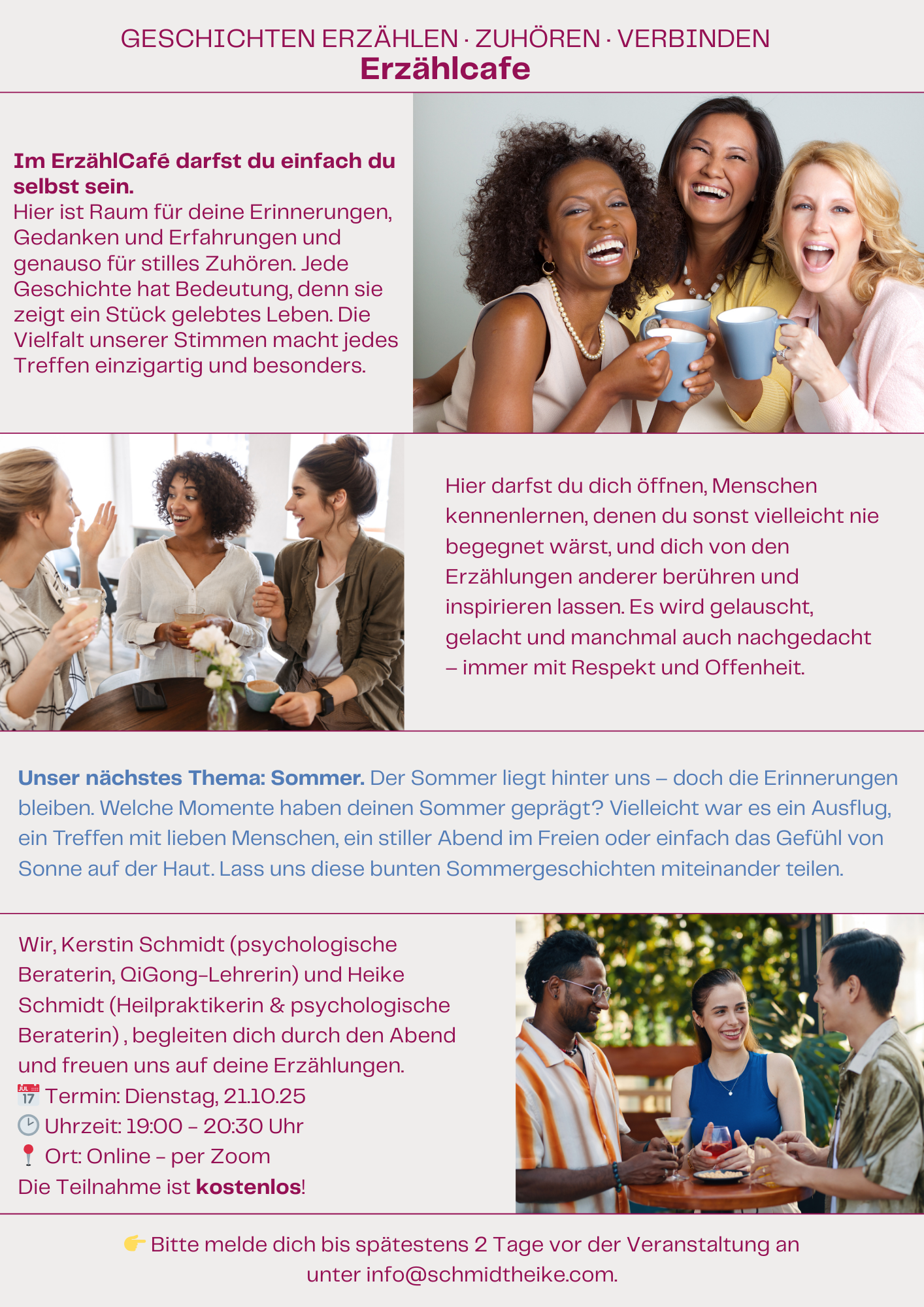 Unser Thema im nächsten Erzählcafé: Sommer. Der Sommer liegt hinter uns - doch die Erinnerungen bleiben. Welche Momente haben deinen Sommer geprägt? Vielleicht war es ein Ausflug, ein Treffen mit lieben Menschen, ein stiller Abend im Freien oder einfach das Gefühl von Sonne auf der Haut. Lass uns diese bunten Sommergeschichten miteinander teilen.